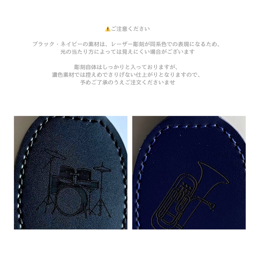 ・ブラックやネイビーの素材は、レーザー彫刻が目立ちにくい仕上がりになります